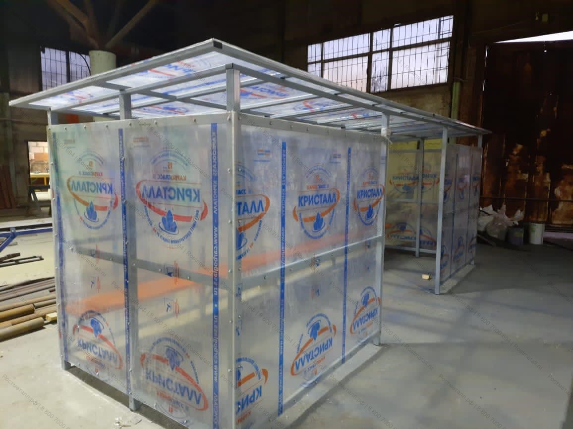• Стены и крыша остановки изготовлены из монолитного поликарбоната толщиной 5 мм, обеспечивая прочность и устойчивость конструкции. Материал обладает хорошей прозрачностью, что позволяет свету проникать внутрь и делает остановку видимой.