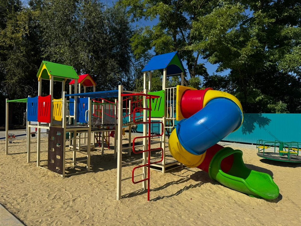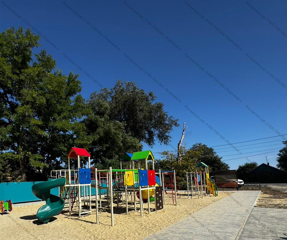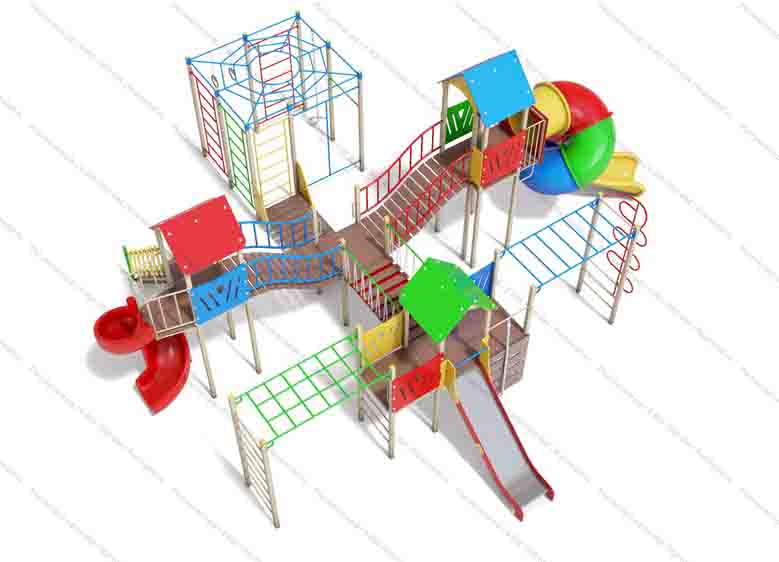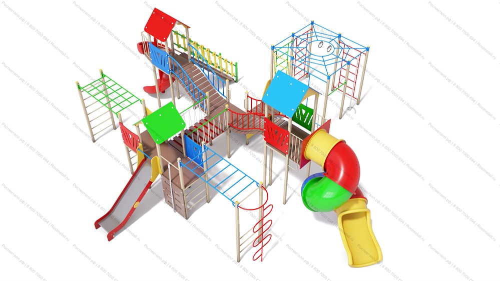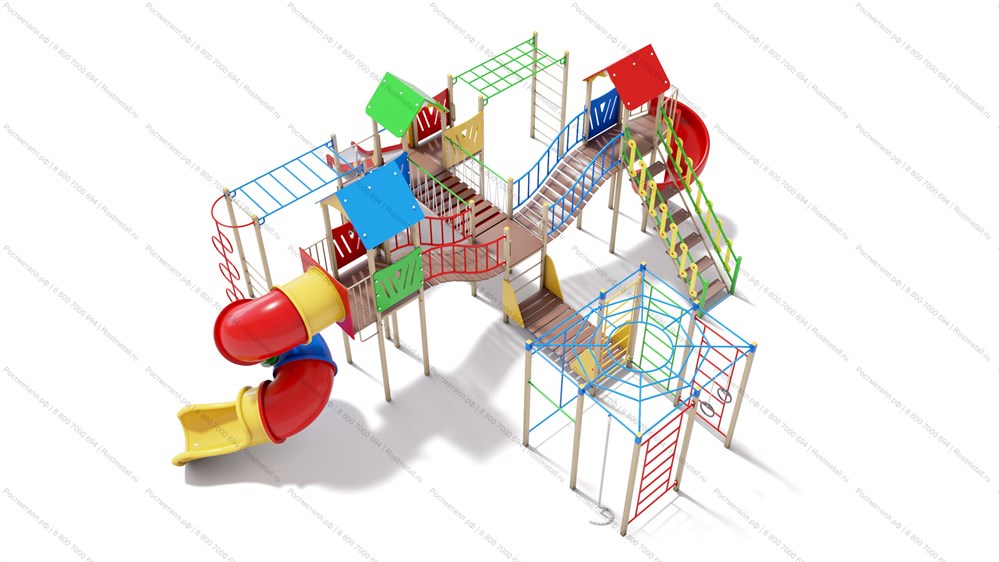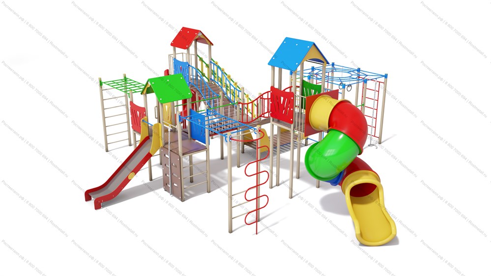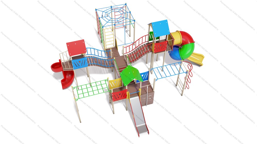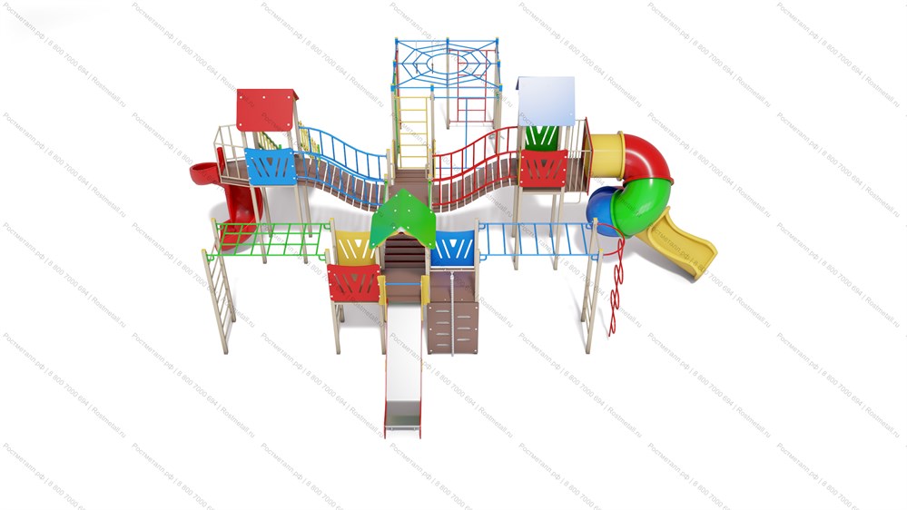 Комплектация  2 башни с балконом, винтовая горка, тоннельная горка, 2 изогнутых моста, прямой мост, подвесной мост, 2 подъёмные лестницы, 4 башни, горка-скат из нерж.стали, рукоход, шест-змейка, рукоход сетка, 3 шведских стенки, рукоход паутинка, канат, турник, лестница, пожарный шест, гимнастические кольца, подъёмник с канатом.
