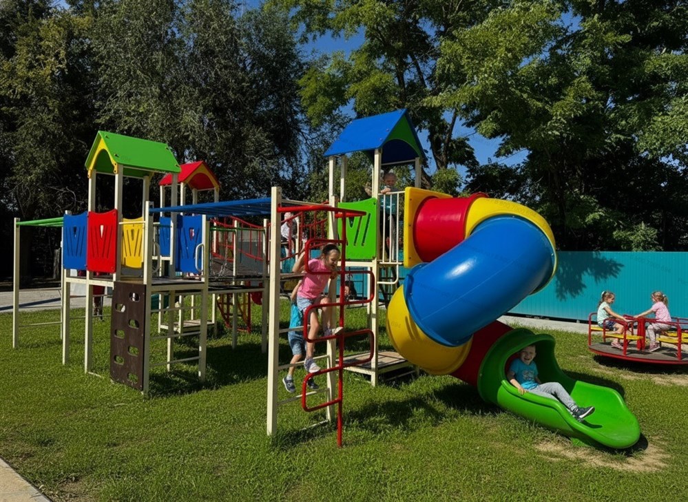 | Комплектация | 3 башни, 2 башни с балконом, горка-скат нерж., горка винтовая, горка тоннельная, 2 мостика изогнутых, подвесной мост, 2 подъемных лестницы, шест-змейка, рукоход, лаз дуга, подъёмник с канатом. |