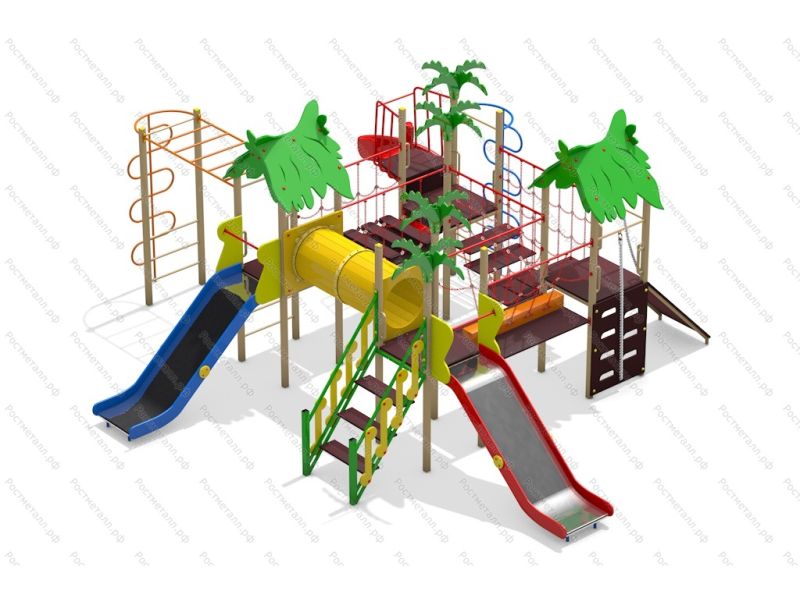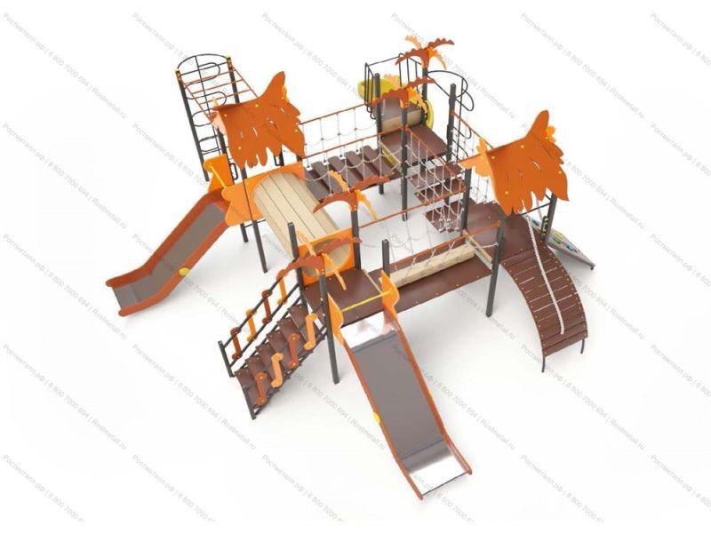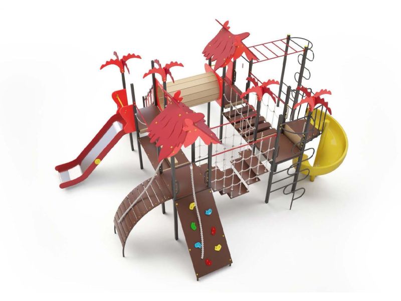 | Комплектация | 3 башни, башня с балконом, 2 ската из нержавеющей стали, винтовая горка, переход туннель, подъёмная лестница, переход с подвесным бревном, подвесной переход, переход лесенка,скаладром с канатом, подъёмник с канатом, 2 шеста-змейка, рукоход. |