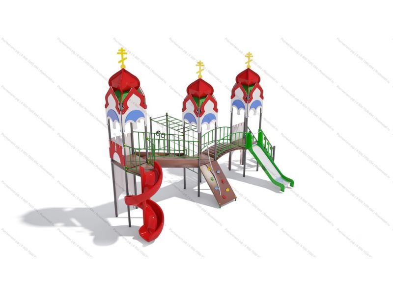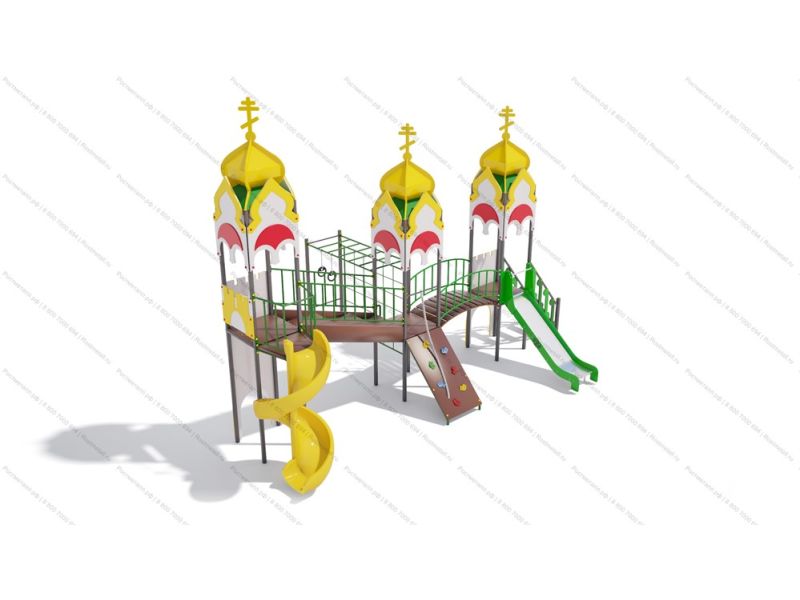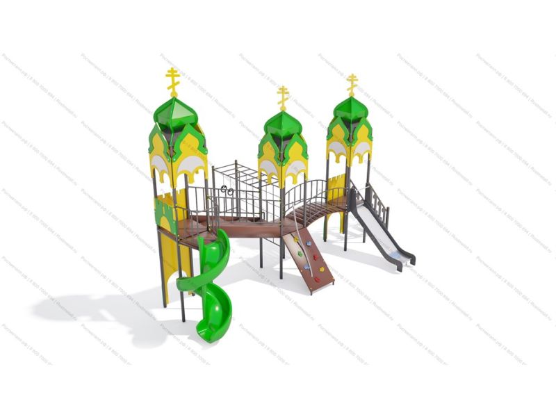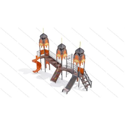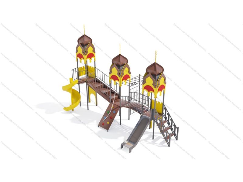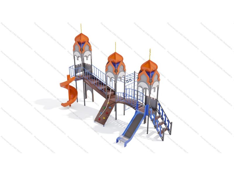 | Комплектация | 3 башни, винтовая горка, мост-лестница, скаладром с канатом, рукоход, кольца гимнастические, лаз-сетка, мостик полукруг, горка-скат из нержавеющей стали, лестница подъёмная. |