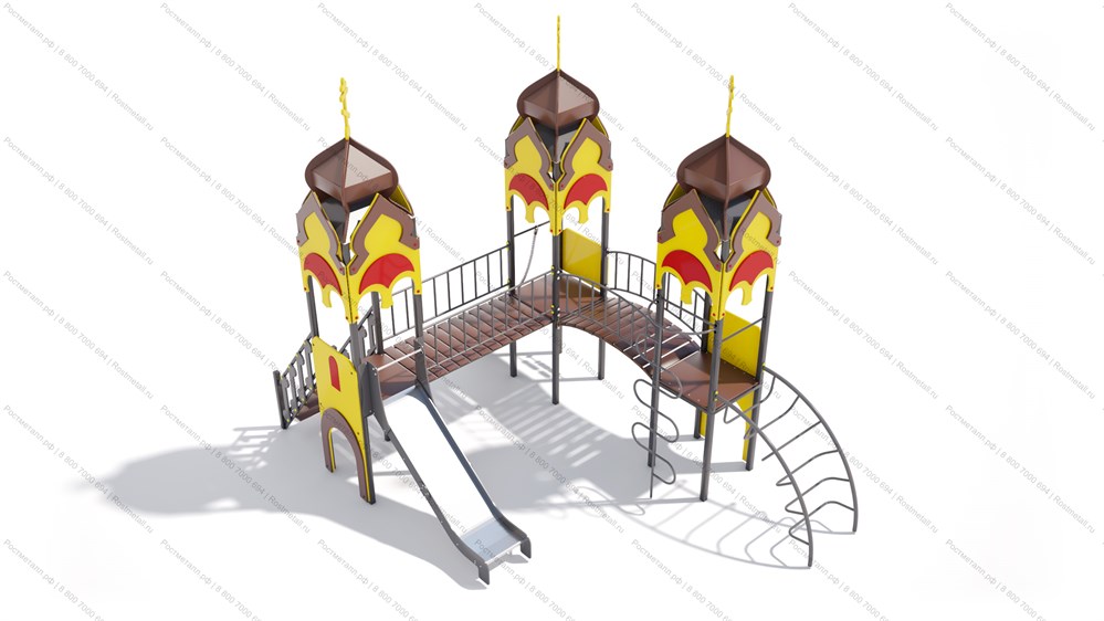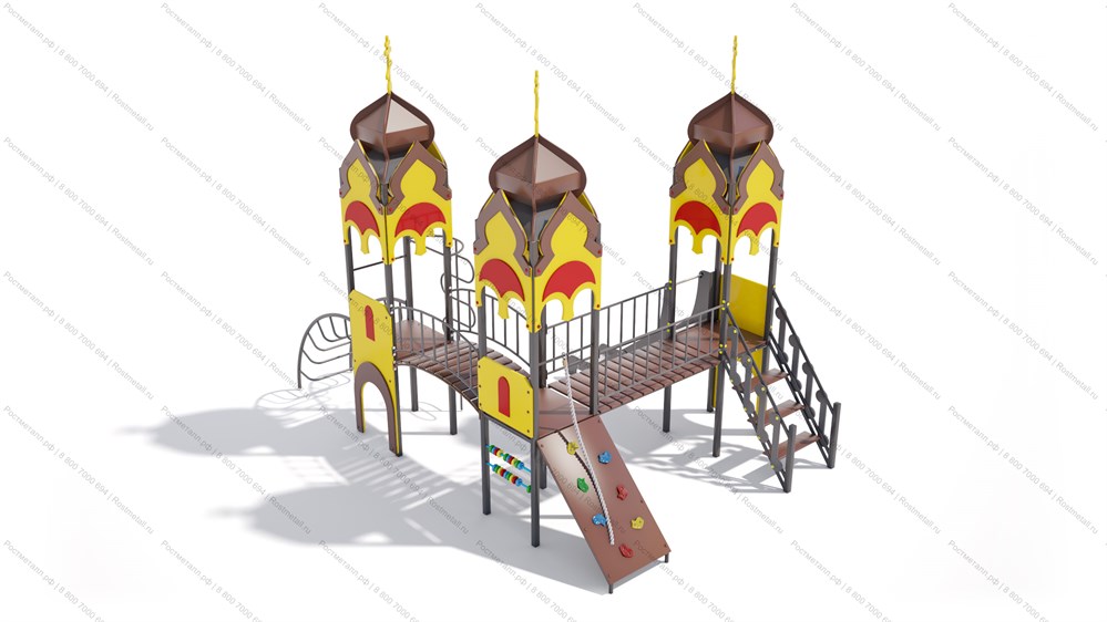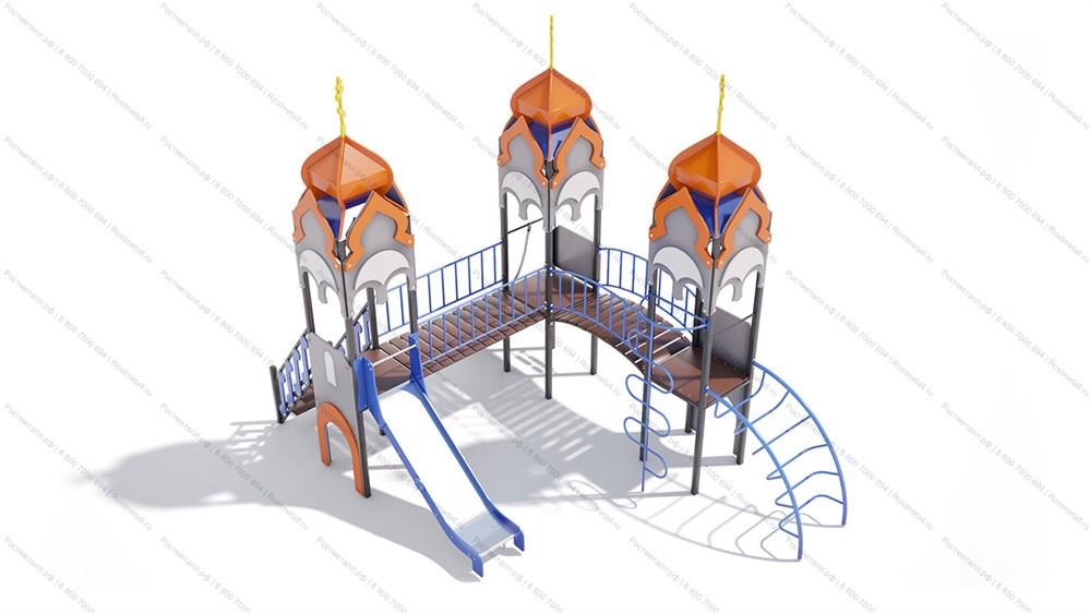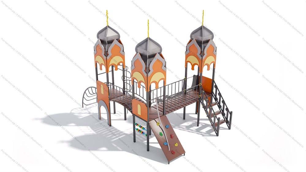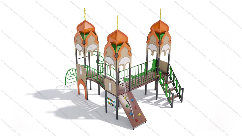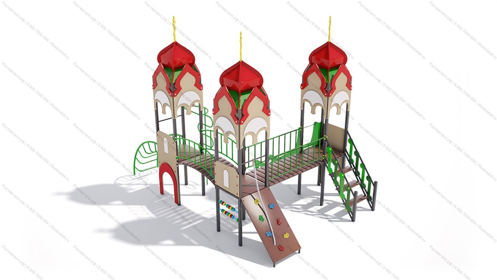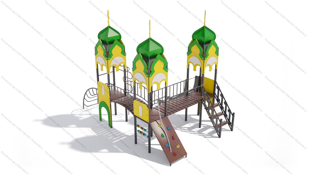 Комплектация | Три башни, скат из нержавеющей стали, подъёмная лестница, прямой мостик, скаладром с канатом, детские счеты, мост полукруг, шест змейка, лаз дуга. |