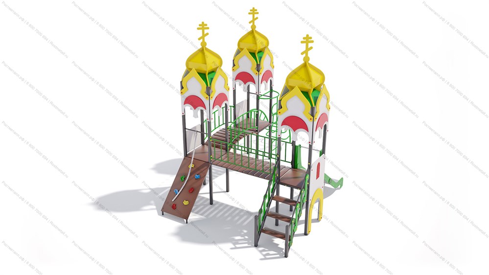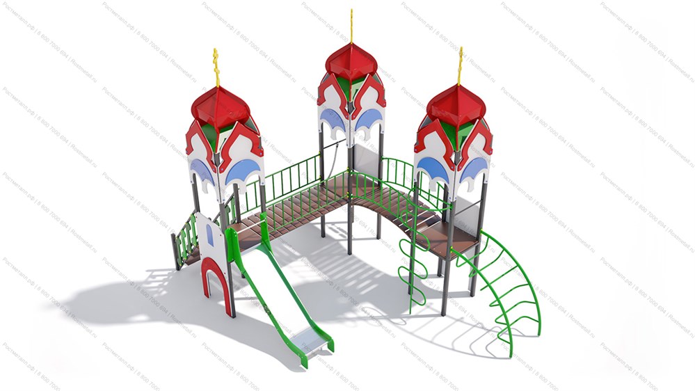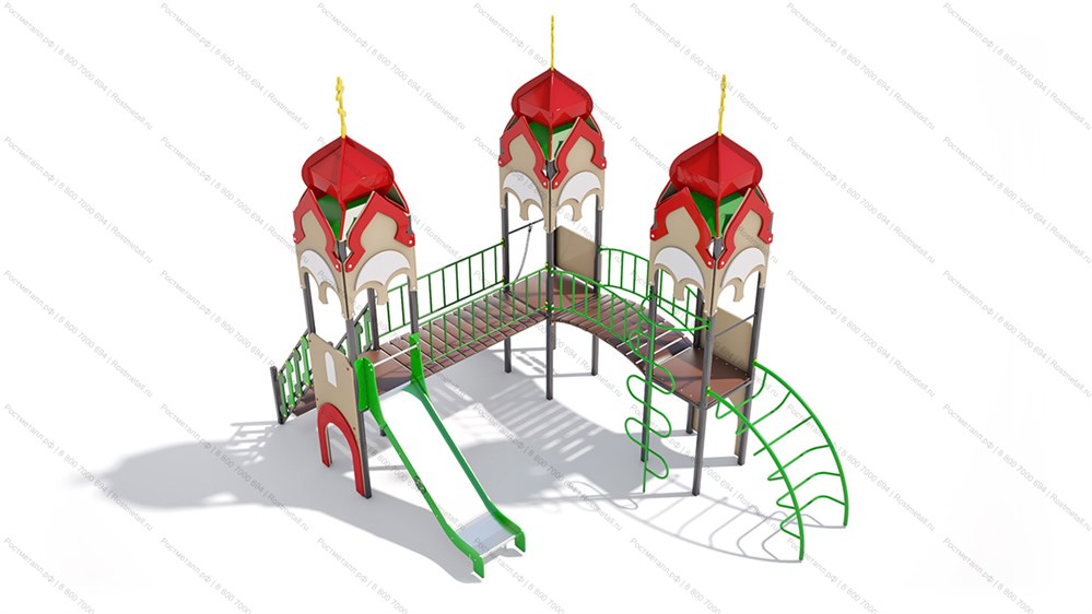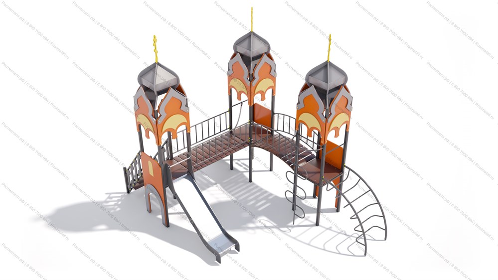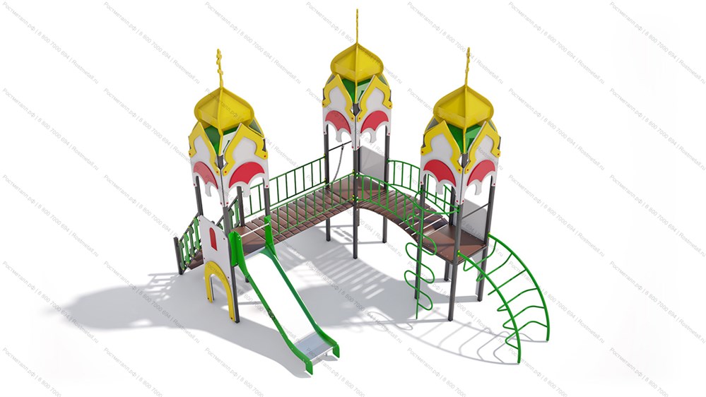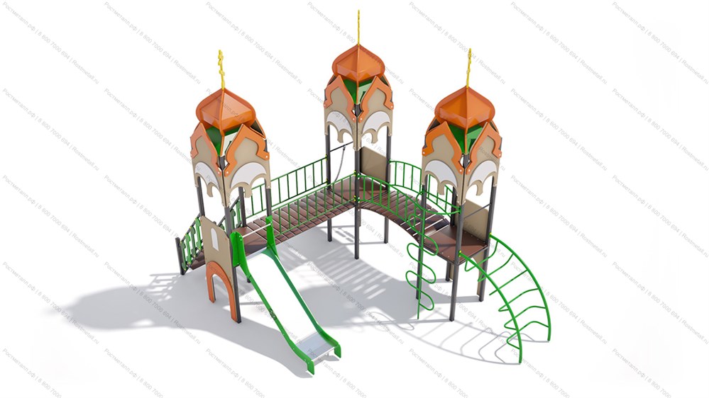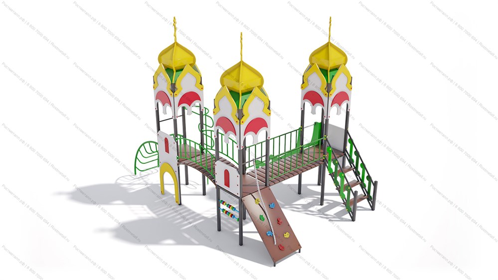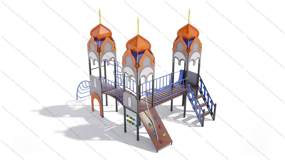 Комплектация | Три башни, скат из нержавеющей стали, подъёмная лестница, прямой мостик, скаладром с канатом, детские счеты, мост полукруг, шест змейка, лаз дуга. |