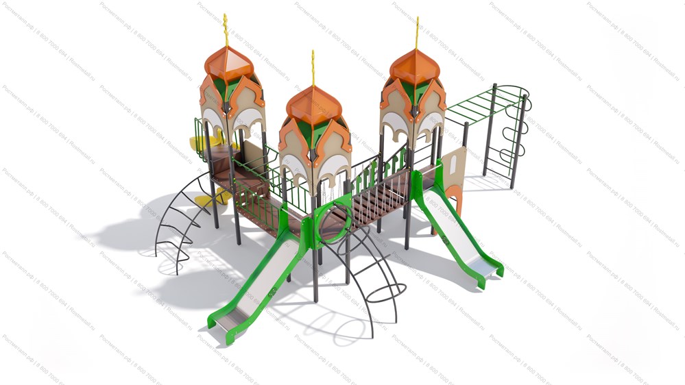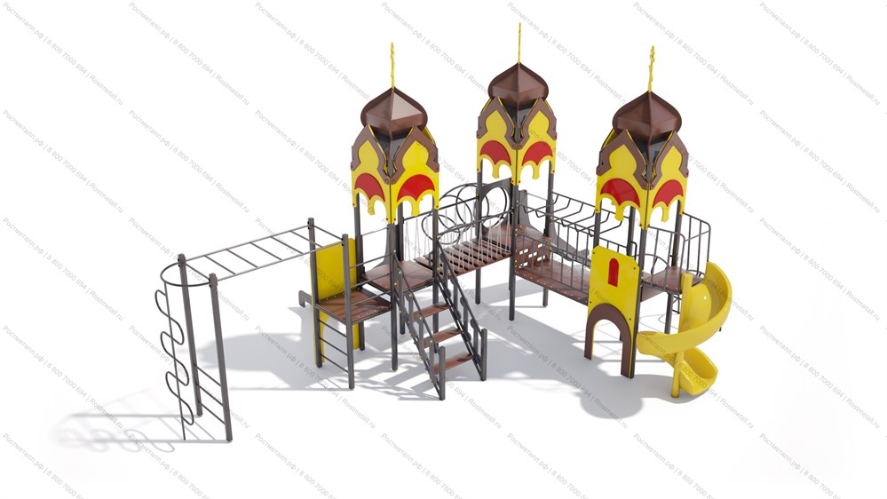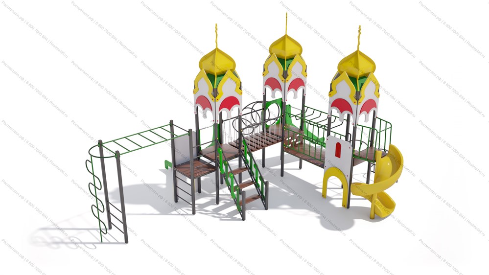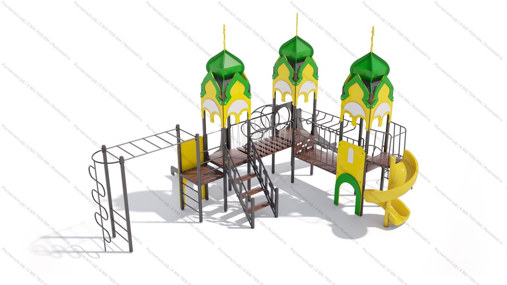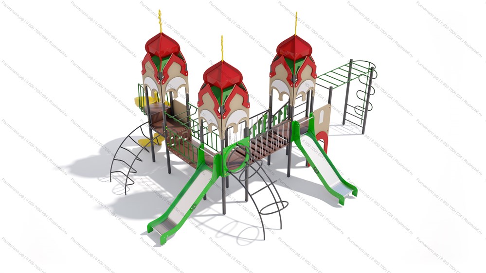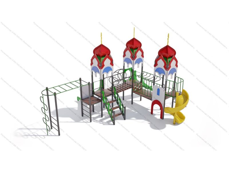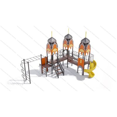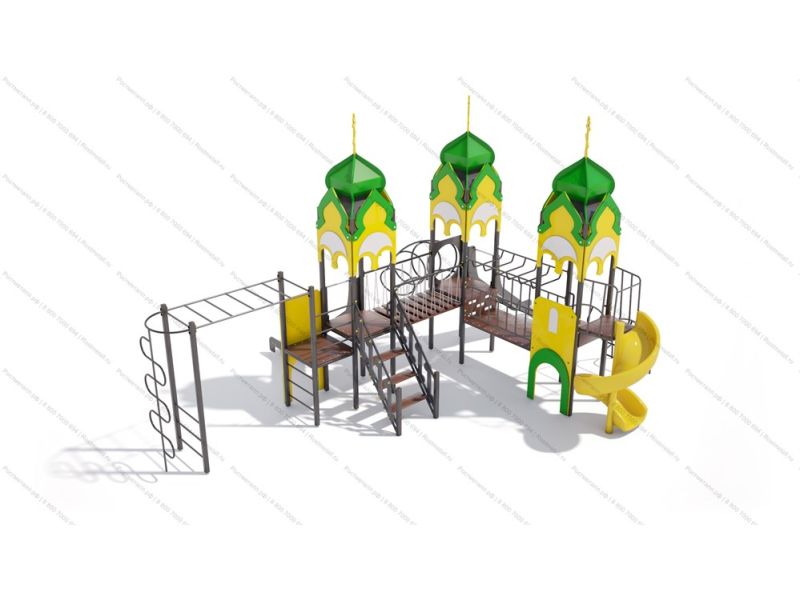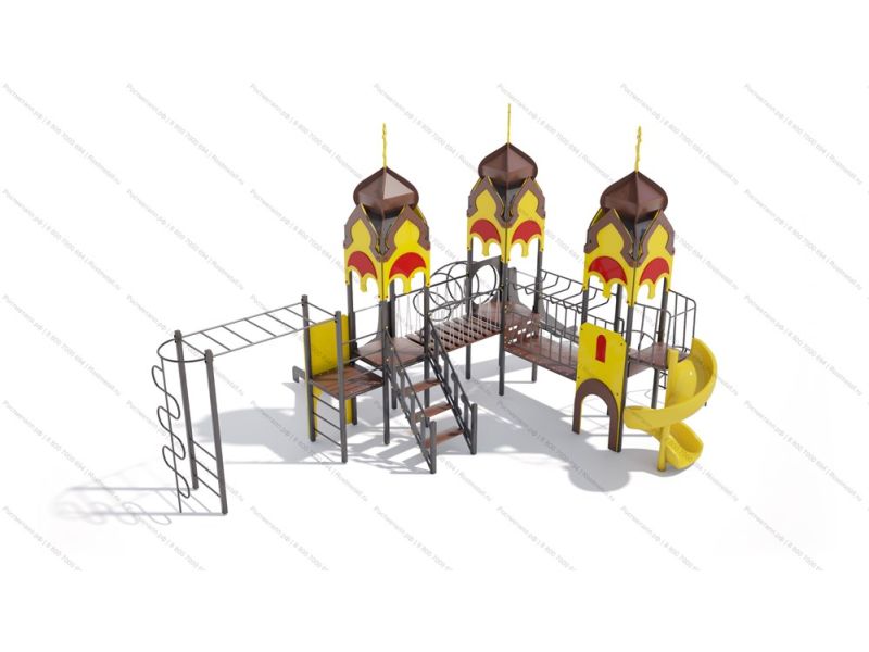 | Комплектация | 2 башни, башня с балконом, винтовая горка, лаз дуга, мост прямой с рукоходом, 2 ската из нержавейки, лаз-тоннель, мост подвесной, лестница подъёмная, рукоход, шест змейка. |