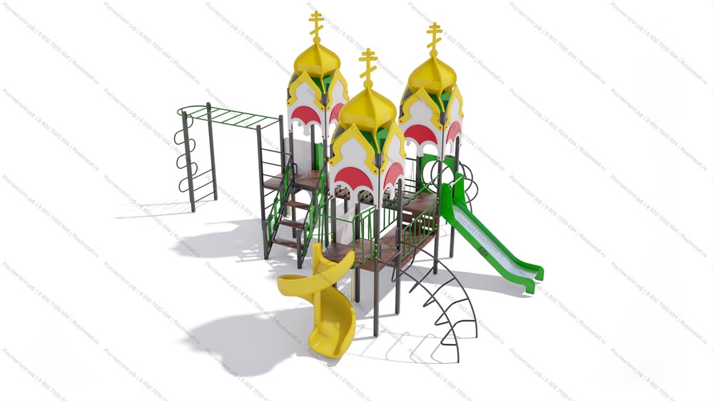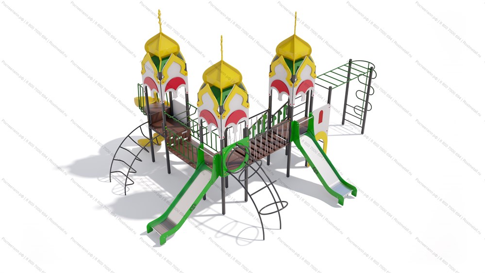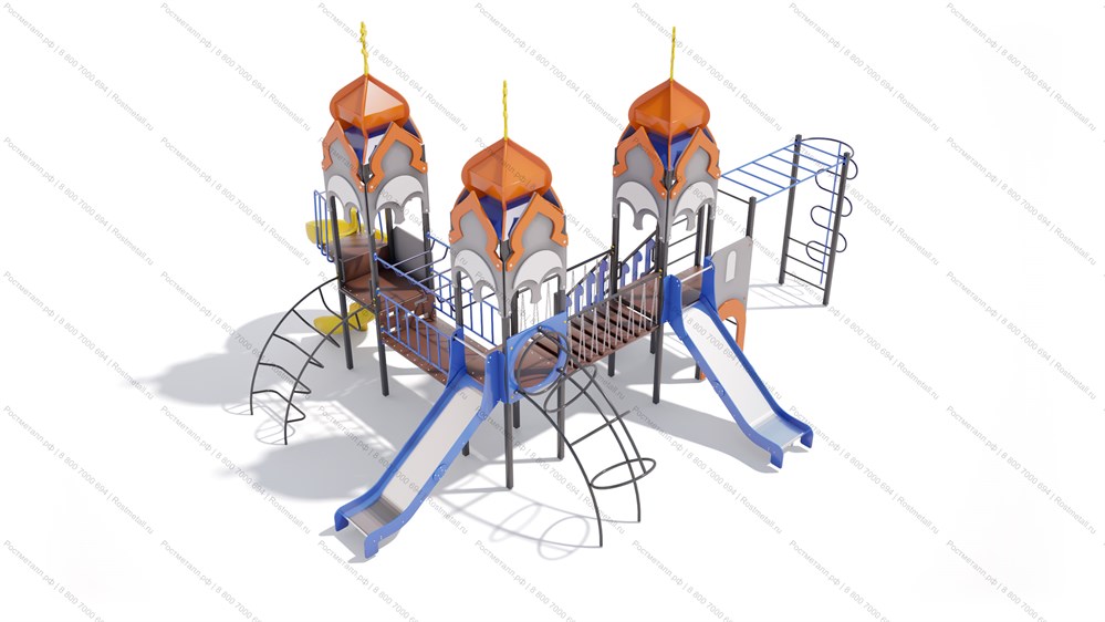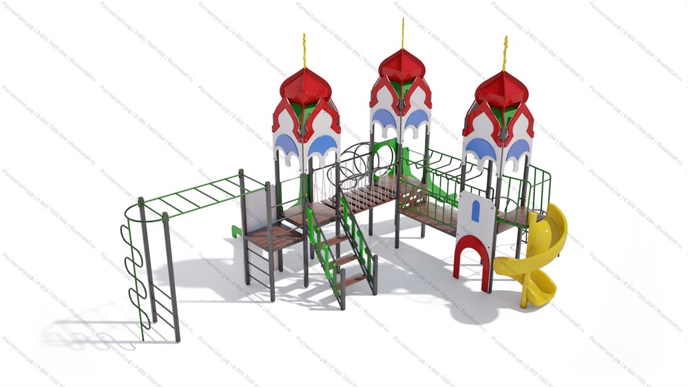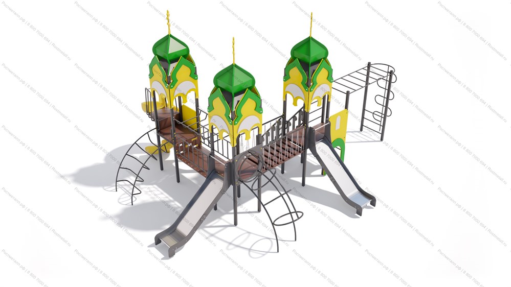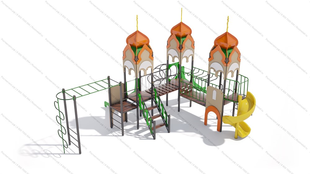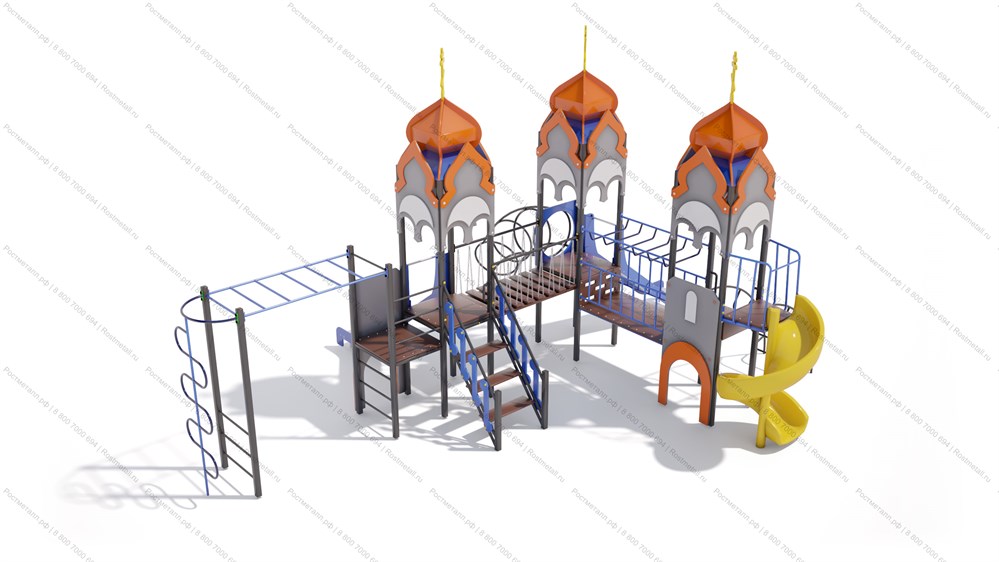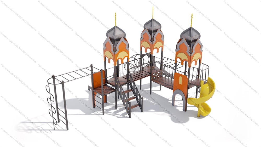 | Комплектация | 2 башни, башня с балконом, винтовая горка, лаз дуга, мост прямой с рукоходом, 2 ската из нержавейки, лаз-тоннель, мост подвесной, лестница подъёмная, рукоход, шест змейка. |