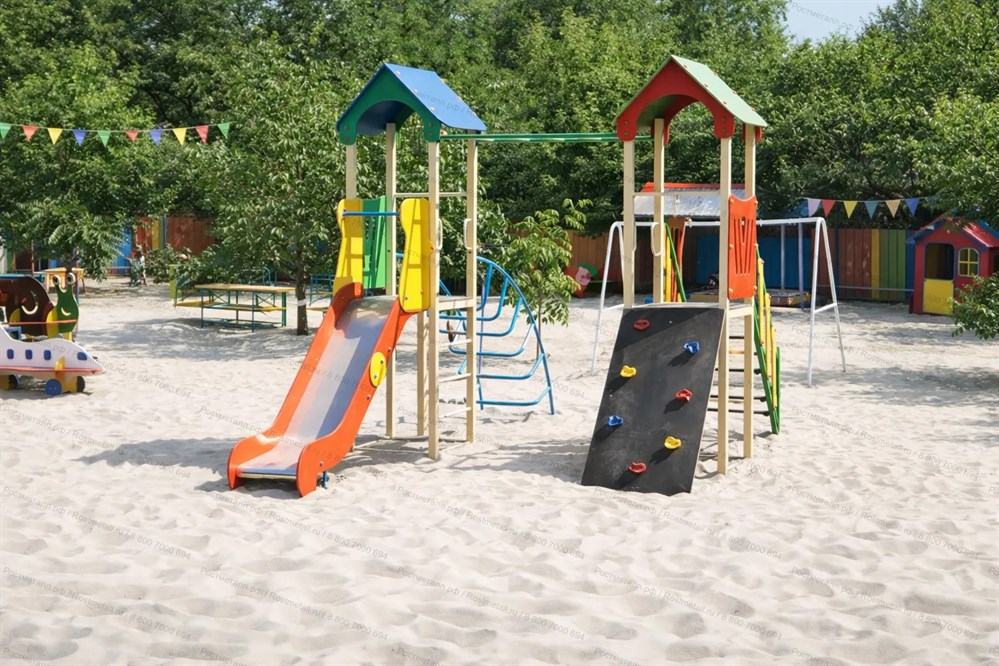 | Комплектация | Две башни, скат из нержавеющей стали, лестница-дуга, рукоход, подъёмная лестница, скалодром с канатом. |