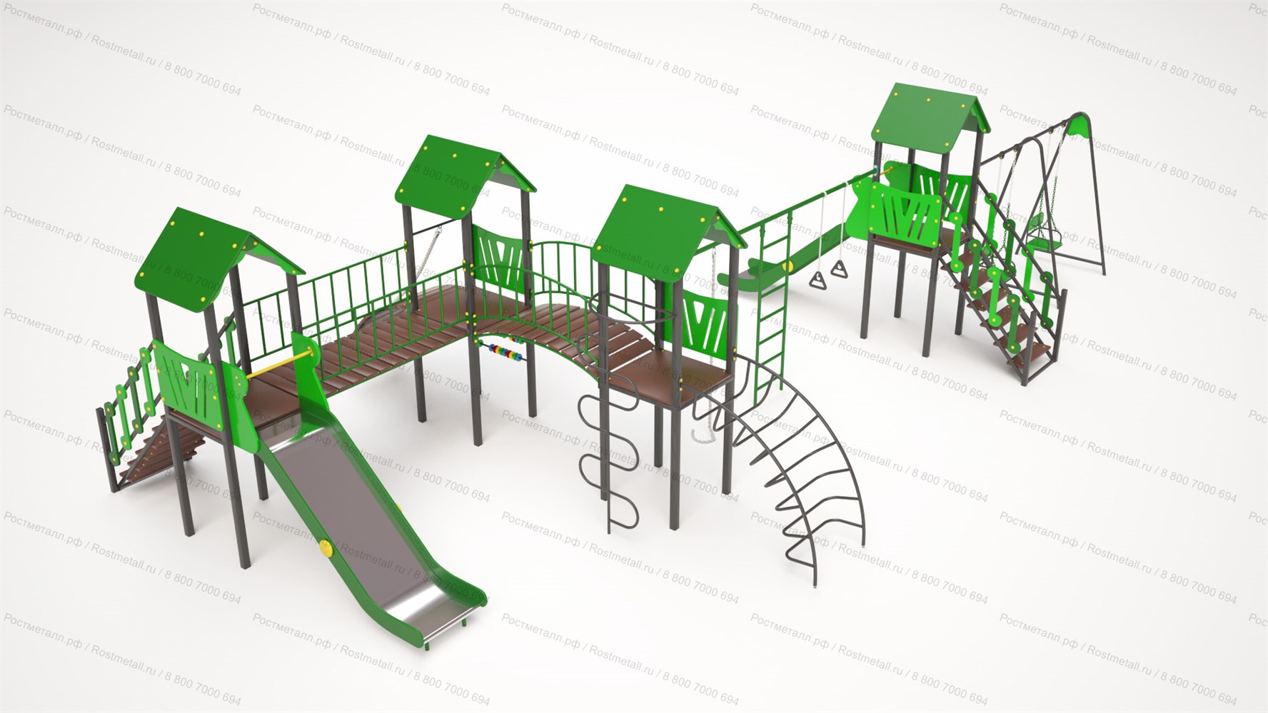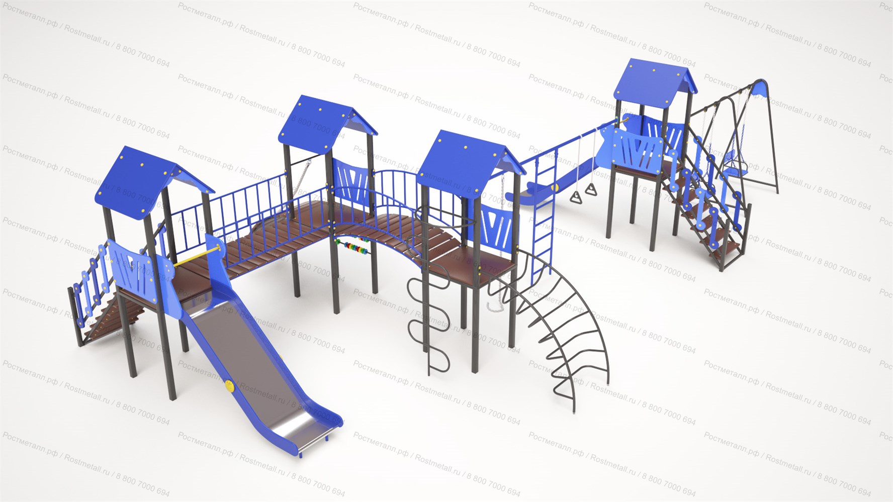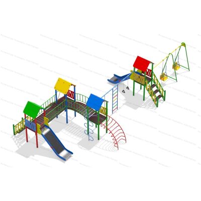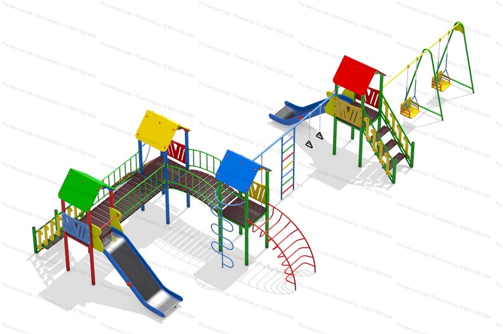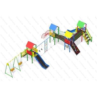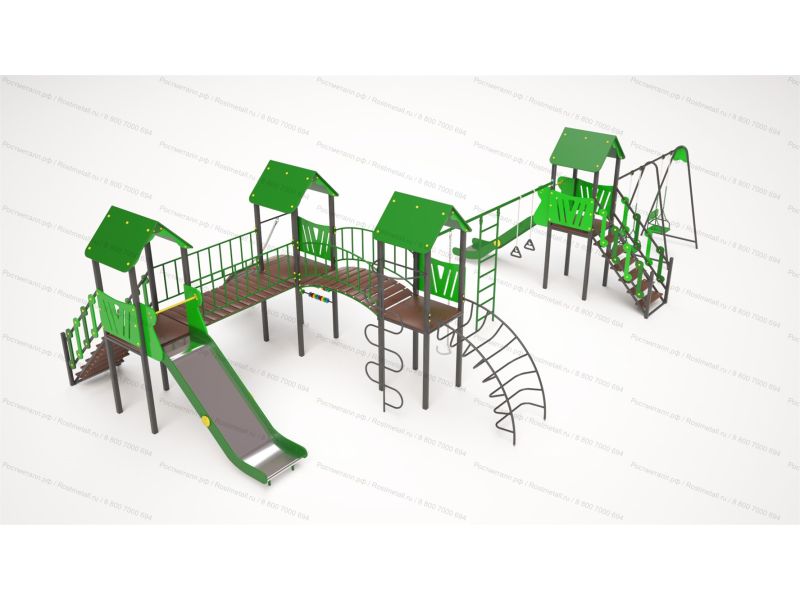 | Комплектация | 4 башни, 2 подъёмные лестницы, 2 ската из нержавеющей стали, прямой мостик, скалодром с канатом, детские счёты, мостик полукруг, шест-змейка, лаз-дуга, канат, шведская стенка, кольца гимнастические, качели двухместные. |