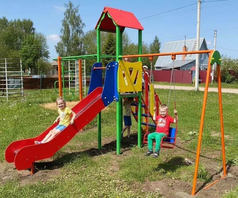 | Комплектация | Башня, лестница подъемная, скат из нержавеющей стали, качели одноместные, рукоход, шест змейка. |