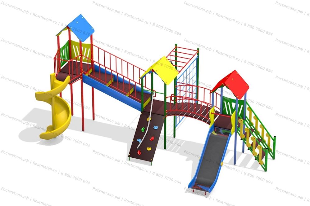 | Комплектация | 3 башни, винтовая горка, мост-лестница, скаладром с канатом, рукоход, кольца гимнастические, лаз-сетка, мостик полукруг, горка-скат из нержавеющей стали, лестница подъёмная. |
