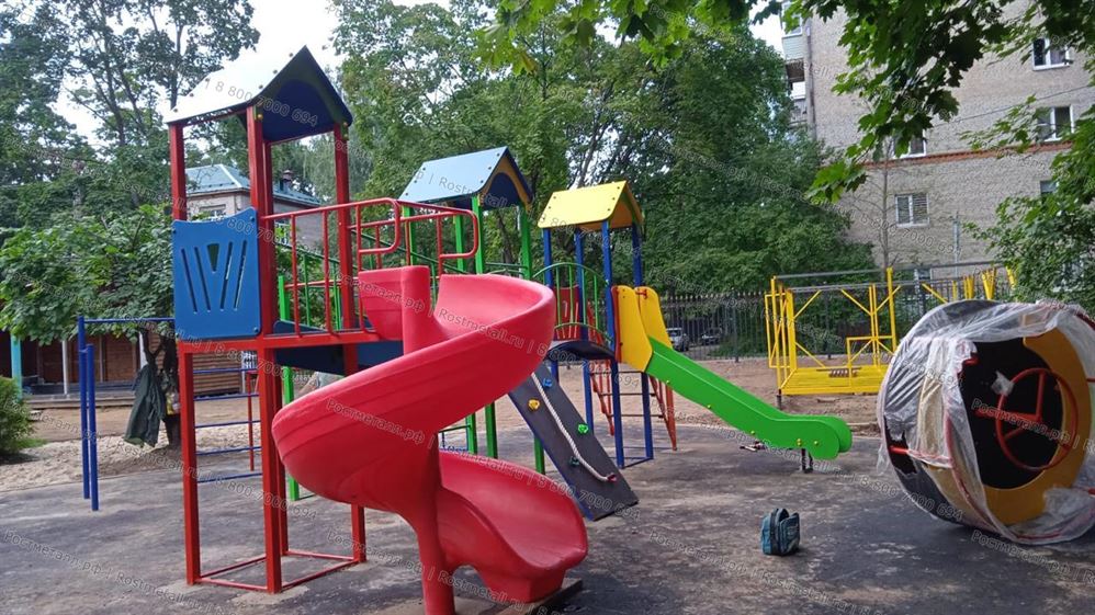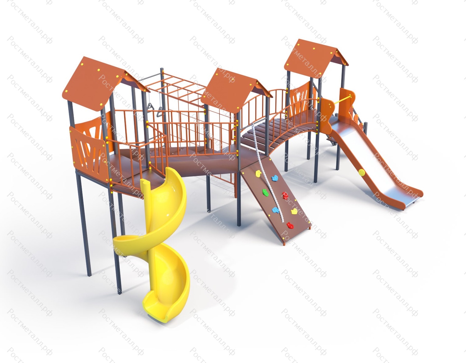 Комплектация | 3 башни, винтовая горка, мост-лестница, скаладром с канатом, рукоход, кольца гимнастические, лаз-сетка, мостик полукруг, горка-скат из нержавеющей стали, лестница подъёмная. |