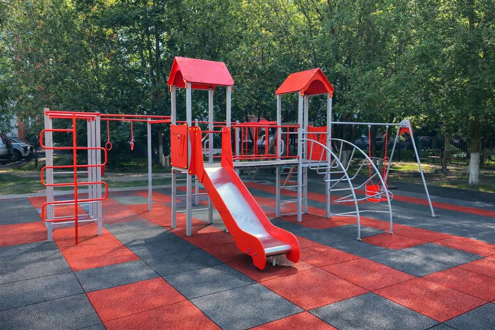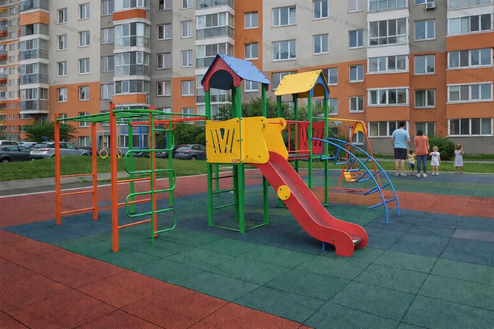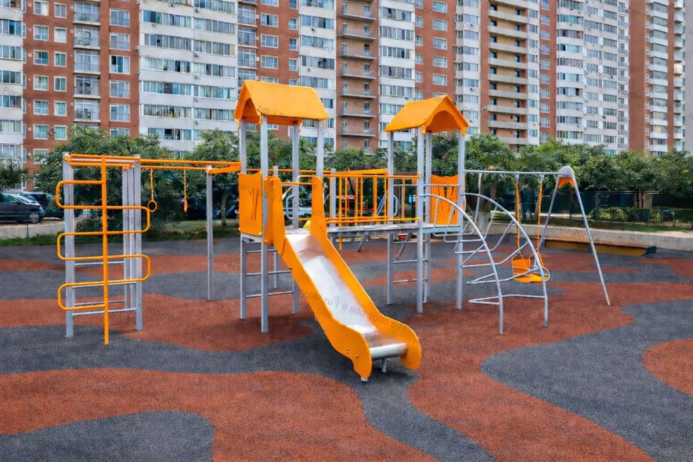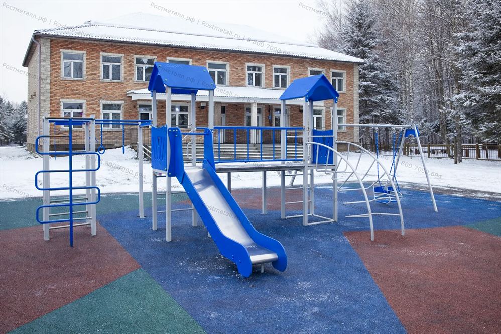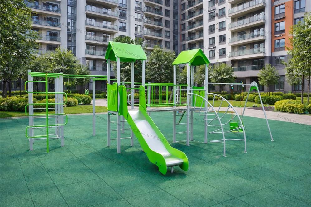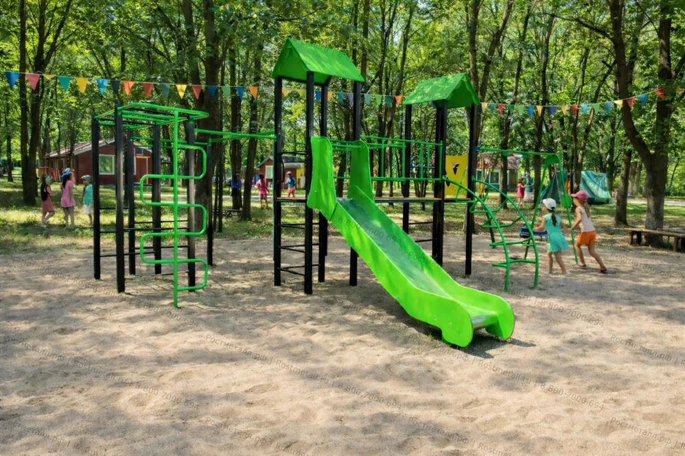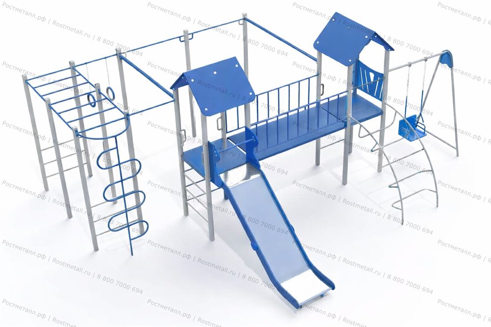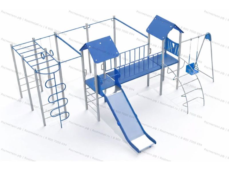 | Комплектация | 2 башни, мост прямой, скат из нержавейки, лаз лиана, качели, 3 турника, турник с гимнастическими кольцами., рукоход, шест-змейка |