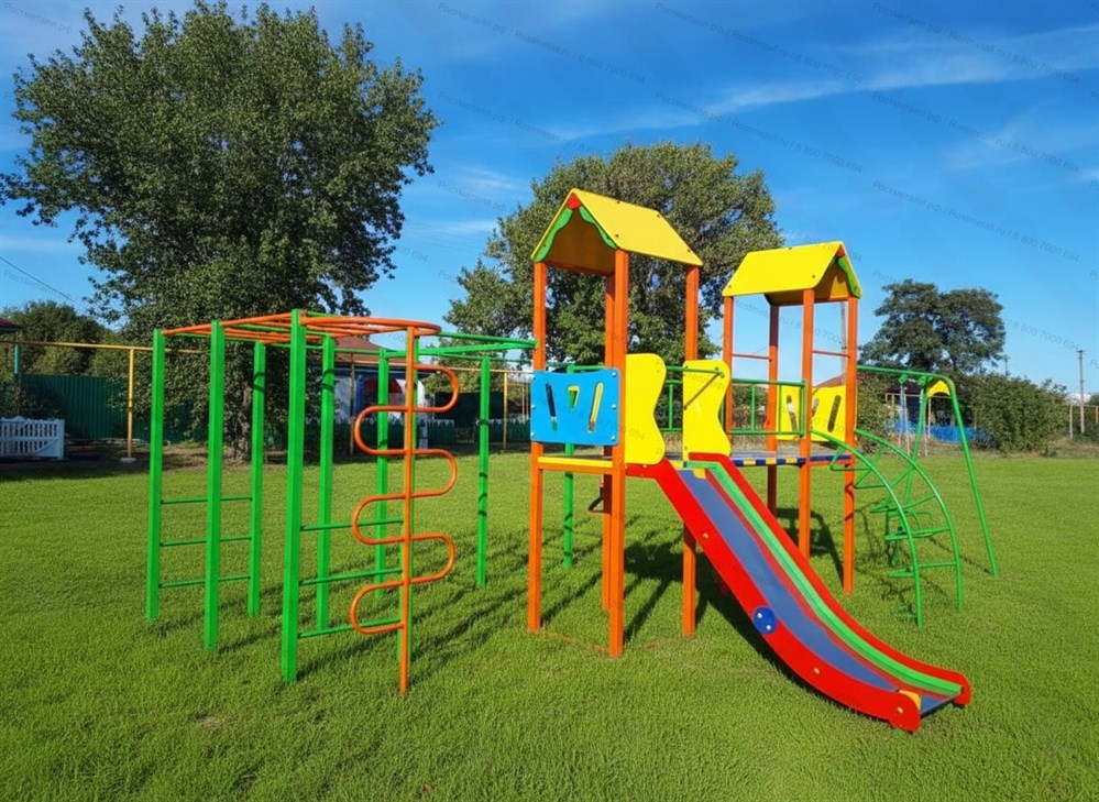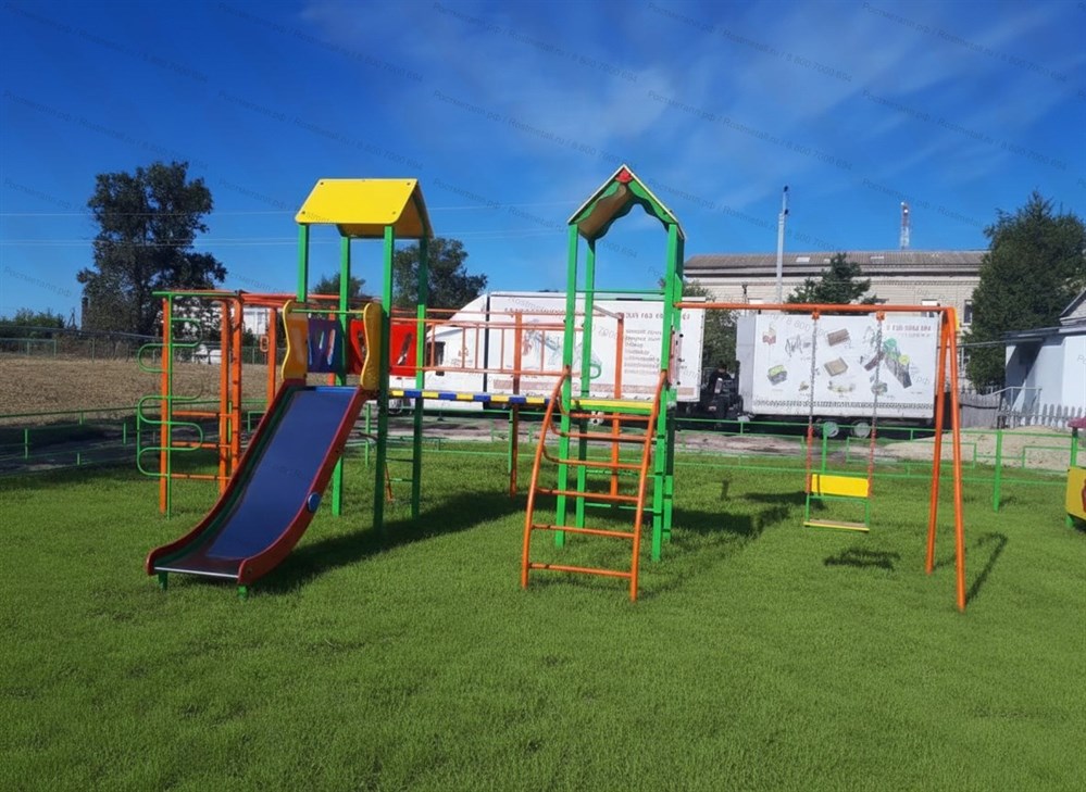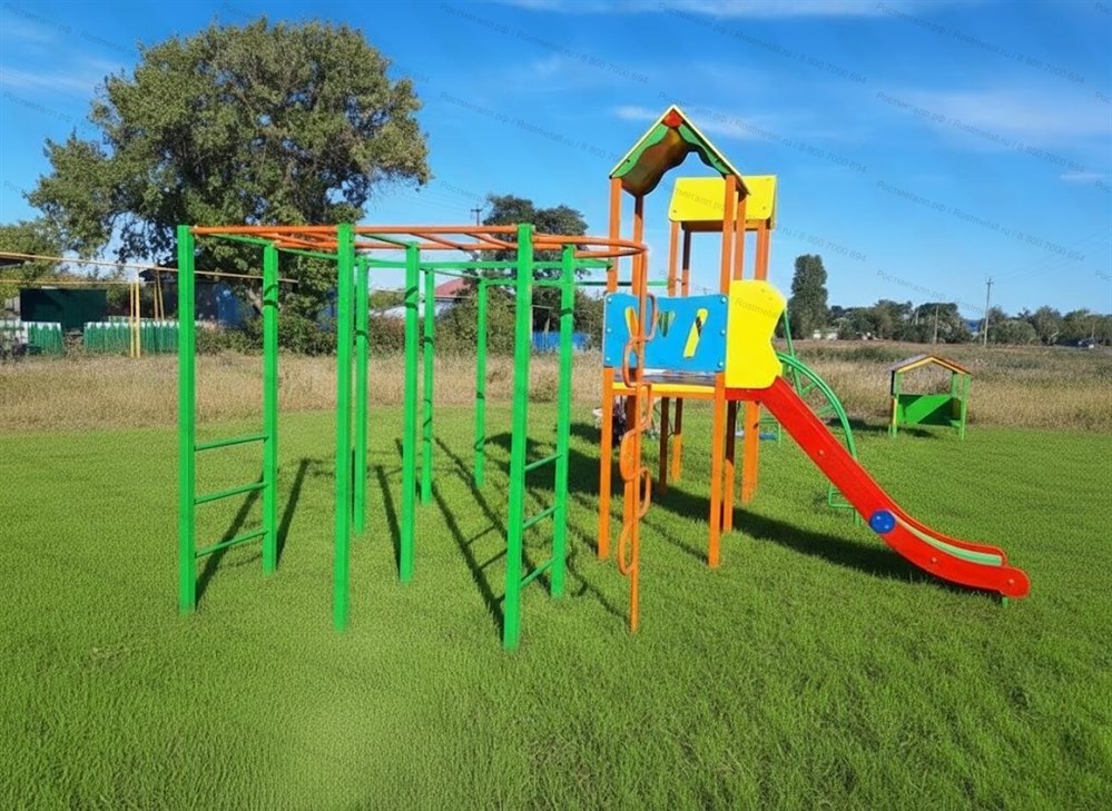 | Комплектация | 2 башни, мостик, скат из нержавейки, лаз дуга, качели, 2 турника, кольца гимнаст., рукоход, шест-змейка. |