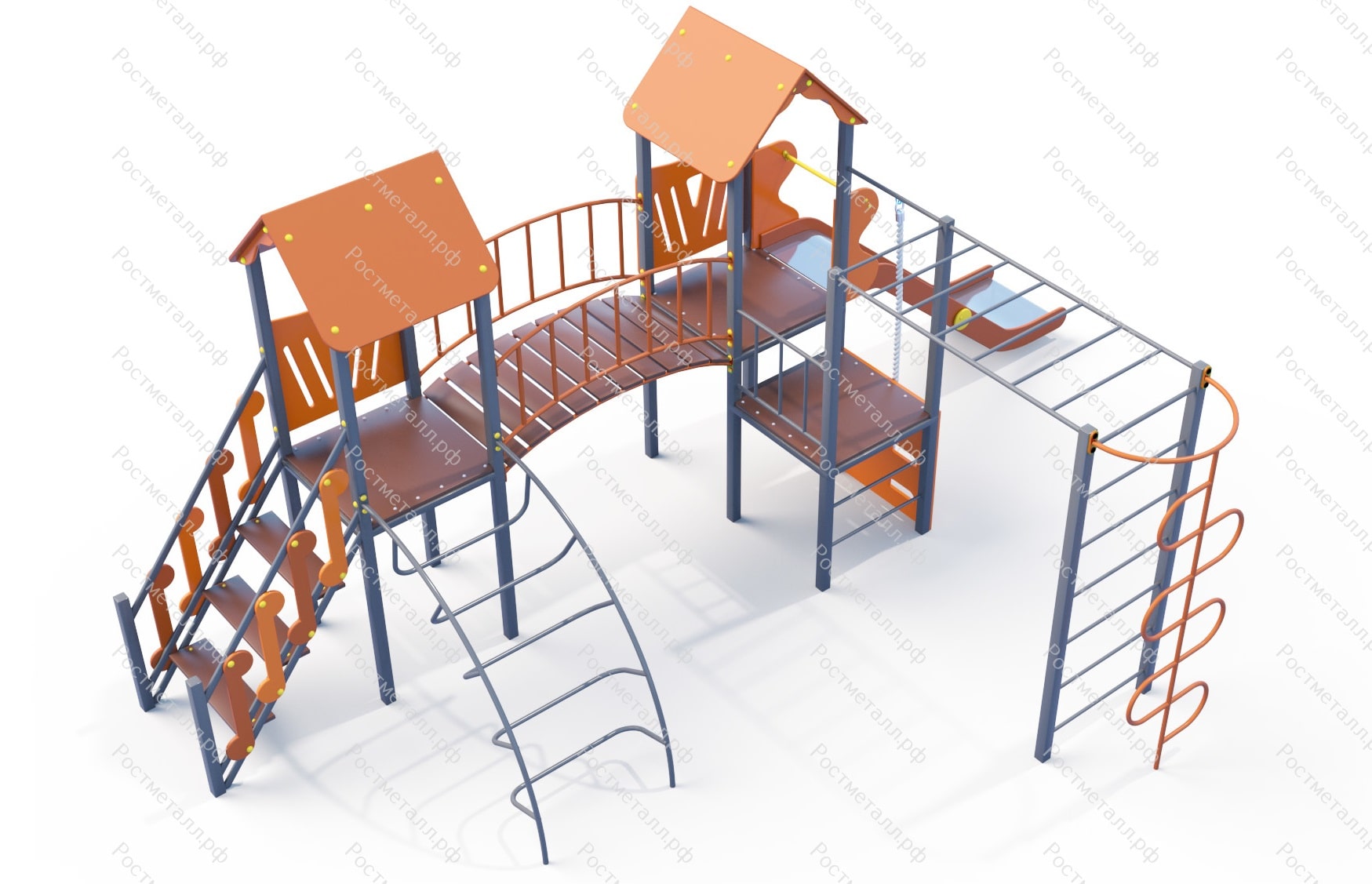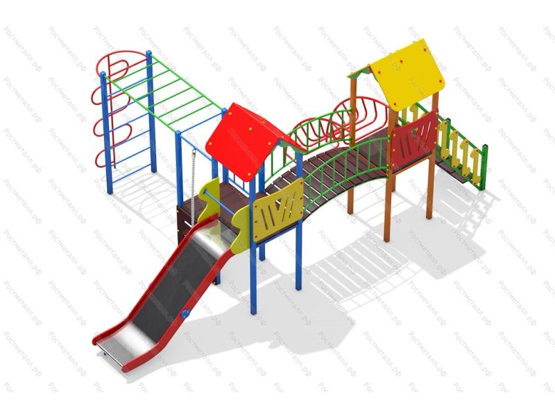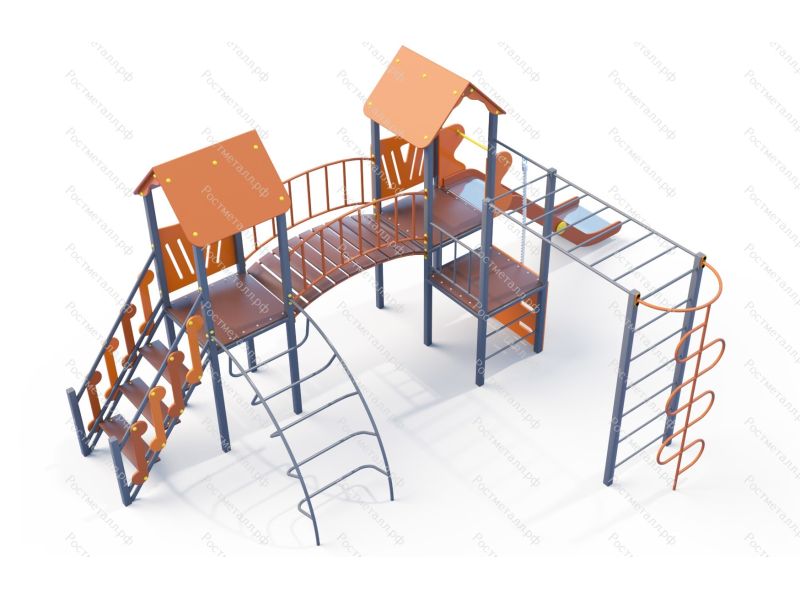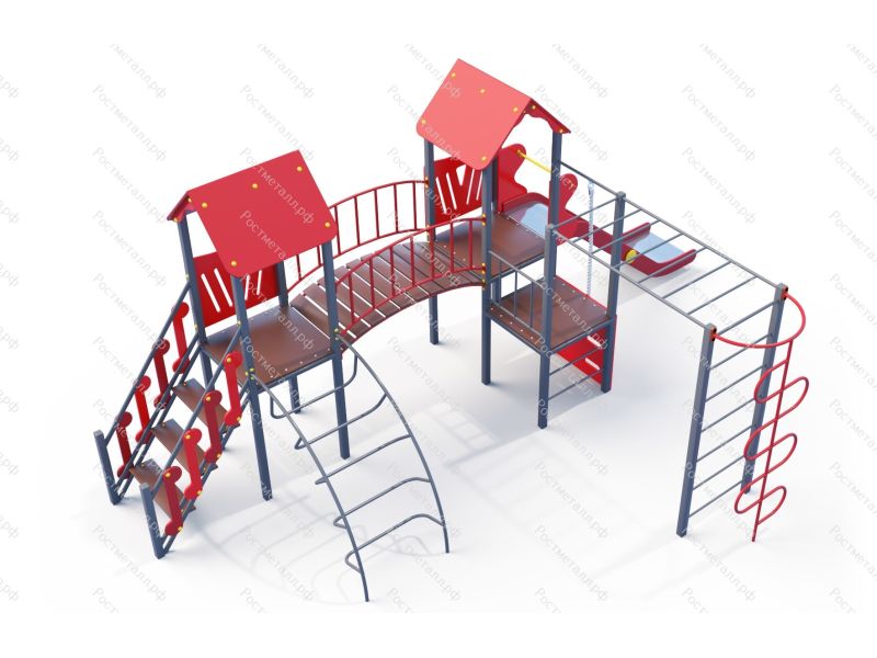 | Комплектация | 3 башни, лестница подъемная, лаз дуга, мостик арочный, горка скат нерж. , подъём с канатом, шест-змейка, рукоход, |