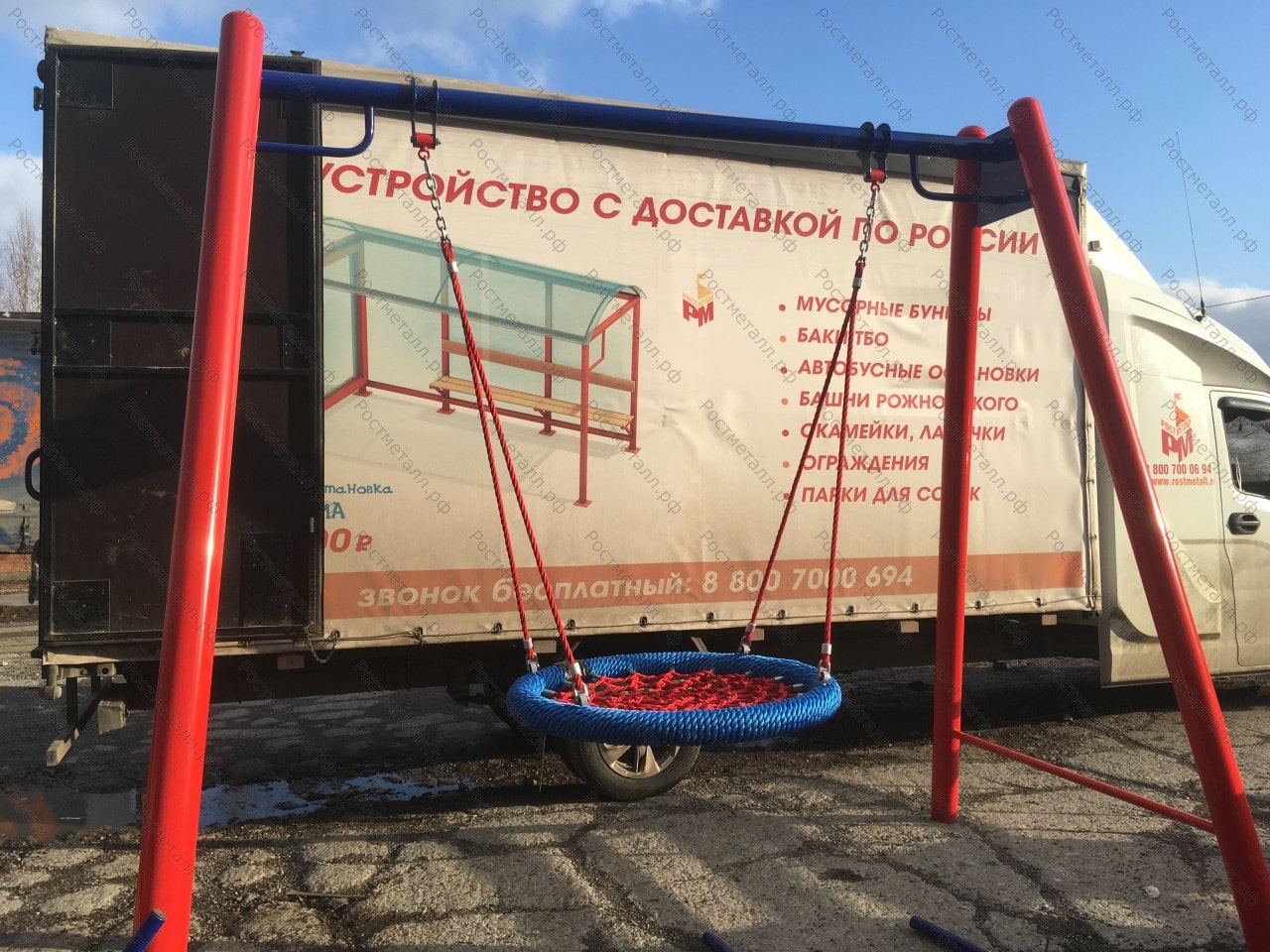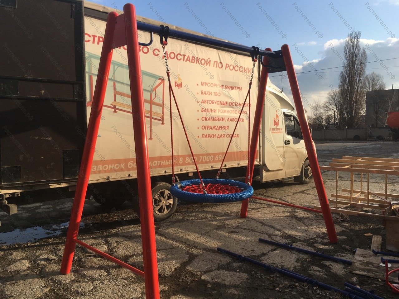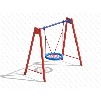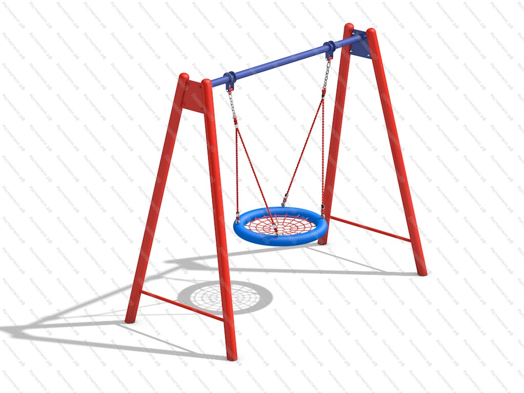 Труба стальная - 108 мм, перекладина - 76 мм, диаметр подвеса Гнездо усиленное - 1000 мм, расстояние от верхней точкой посадочного места до уровня земли - 400 мм порошковая окраска двух цветов. |