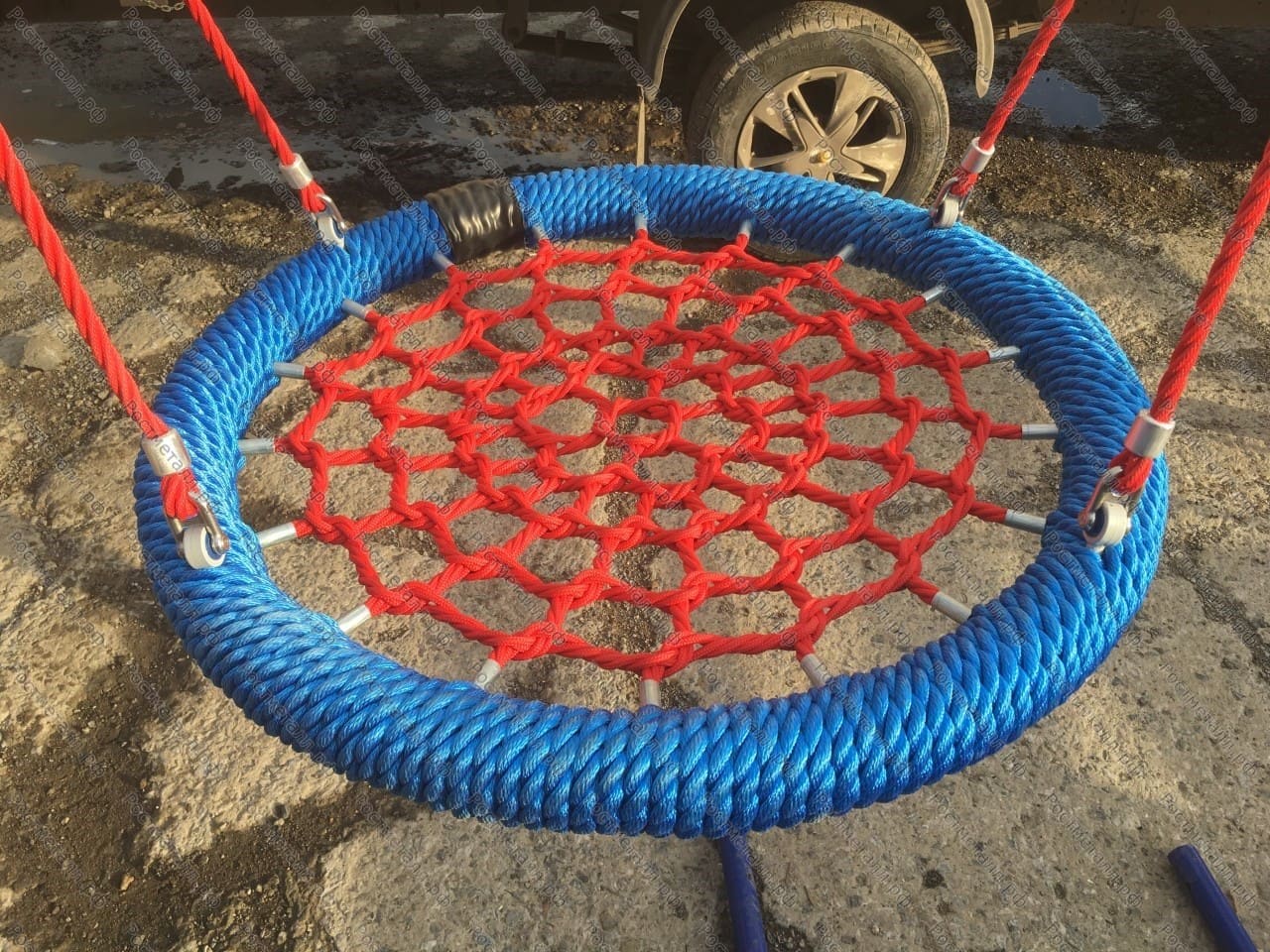 | Материал подвеса | Плетение внутри кольца выполнено из четырехпрядного армированного каната диаметром 16 мм. Диаметр обода после оплётки канатом составляет 90 мм. Качели комплектуются подвесами из шестипрядного армированного каната. Длина подвесов — 1340 мм. Качели рассчитаны на интенсивное использование, выдерживают нагрузку до 250 кг — подходят для игровых площадок в общественных местах (парках, скверах, придомовых территориях). |