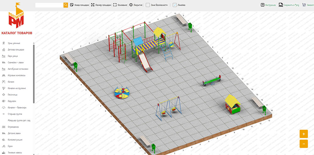 Эта страница представляет собой интерактивный онлайн-конструктор от компании «Ростметалл», предназначенный для проектирования и планирования площадок благоустройства (детских, спортивных или зон отдыха).