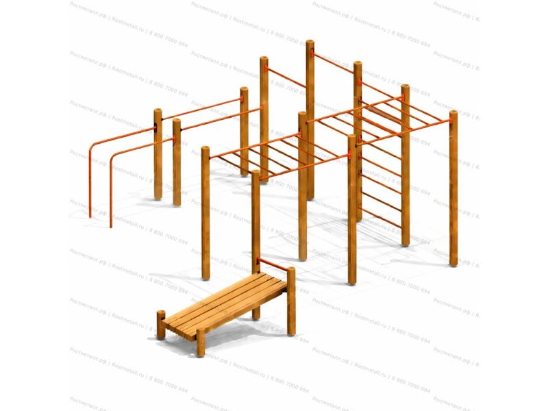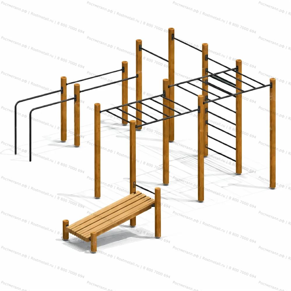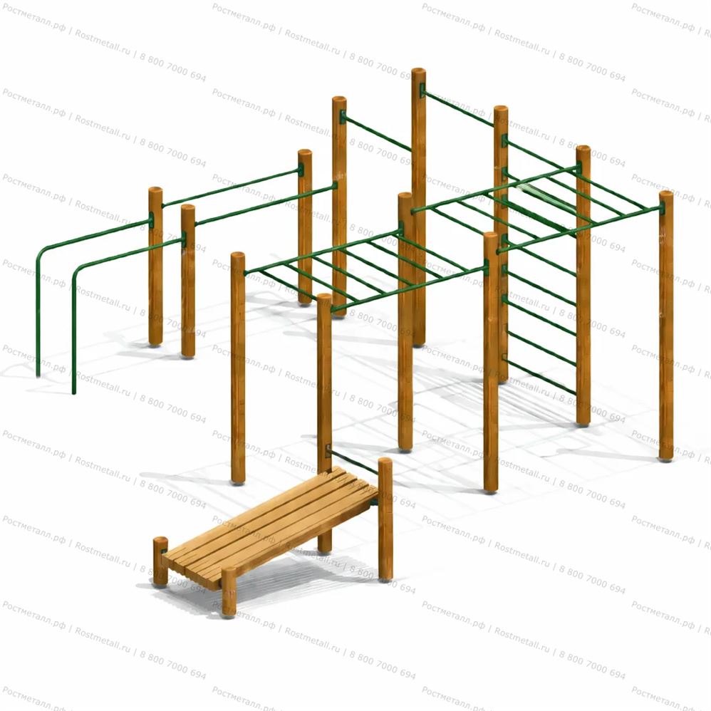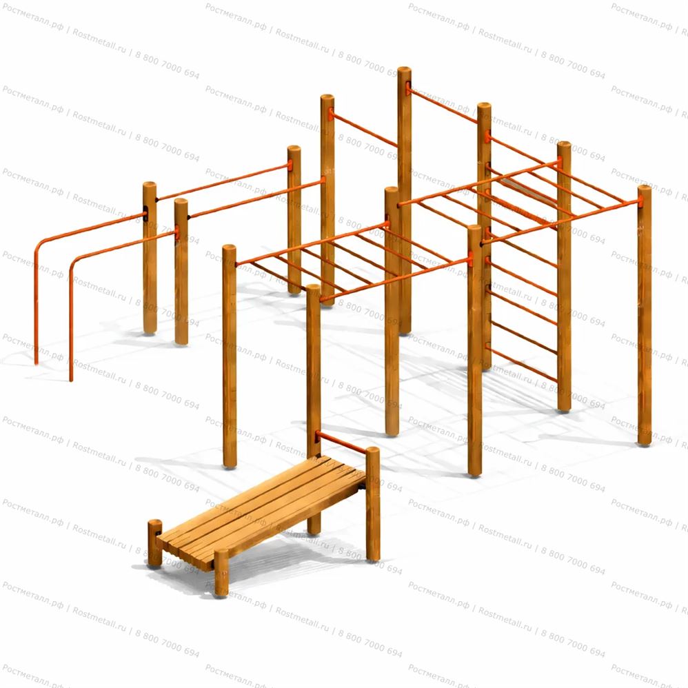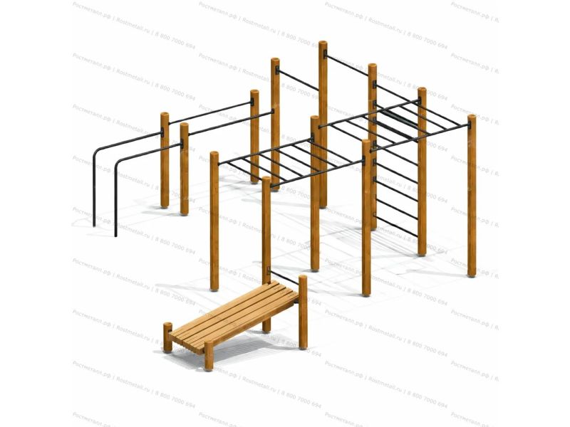 Нажми, чтобы открытьСпортивный комплекс состоит из 14 несущих стоек, на которые крепятся следующие элементы: шведская стенка, рукоход двойной разноуровневый, 2 разноуровневые перекладины, наклонная скамья для пресса, брусья двойные разноуровневые. Несущие круглые столбы комплекса выполнены из округлых бревен и имеют скругленный торец. Все кромки скруглены радиусом не менее 3 мм. Вертикальные столбы снизу заканчиваются металлическим подпятником, который бетонируется в землю. Перекладины шведской стенки и разноуровневые перекладины выполнены из металлической трубы. Наклонная скамья для пресса состоит из деревянных досок. Разноуровневый рукоход выполнен из 6-х опорных столбов и перекладин из трубы. Приставные параллельные брусья представляют собой стойки, согнутые в форме буквы «Г», одним концом бетонируются в землю, а другим с помощью штампованных фланцев крепятся к несущим стойкам. Брусья выполнены из трубы. |