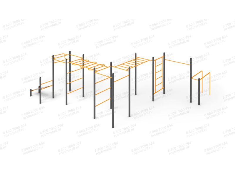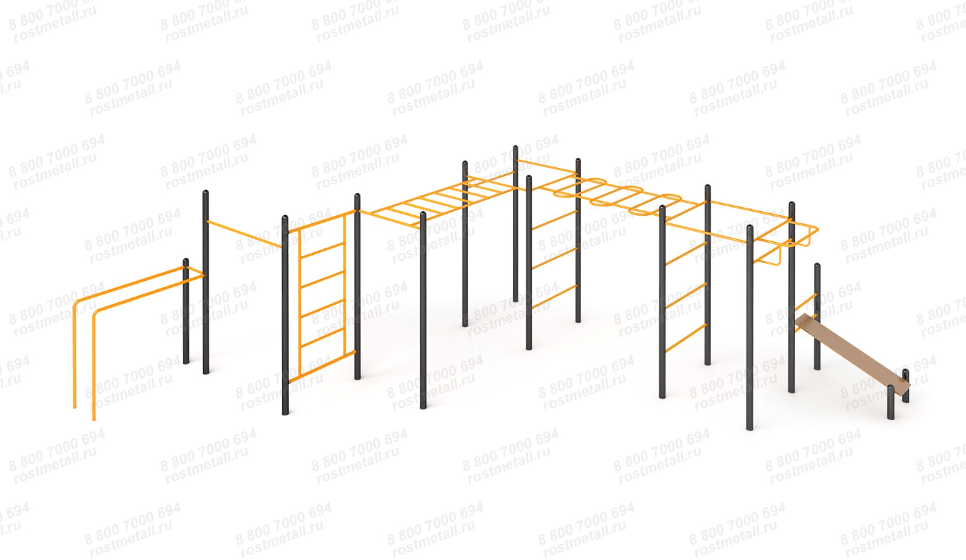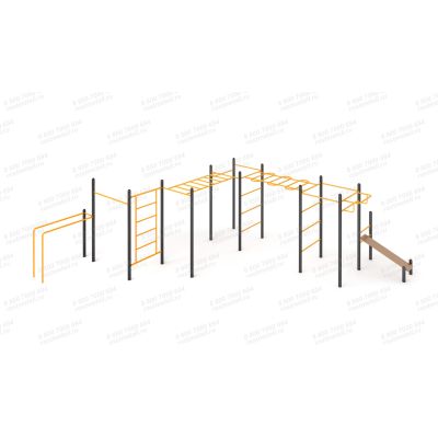 Столбы конструкции трубы, d - 89 мм. Турники, выносной турник, стяжки и шведская стенка изготовлены из водогазопроводной трубы, d - 33,5 мм. Перекладины шведской стенки крепятся на трубу - 40х20мм, сверху и снизу стяжки d - 42,3 мм.