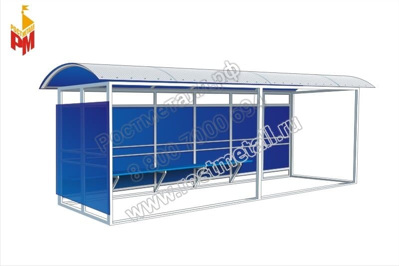 Материал стенок остановки - сотовый поликарбонат толщиной 10 мм, обеспечивающий надежную защиту от внешних воздействий и сохраняющий прозрачность. Каркас остановки состоит из стоек толщиной 60х60 мм с заполнением из труб размерами 60х40 мм и 40х20 мм, обеспечивая прочность и устойчивость конструкции.
